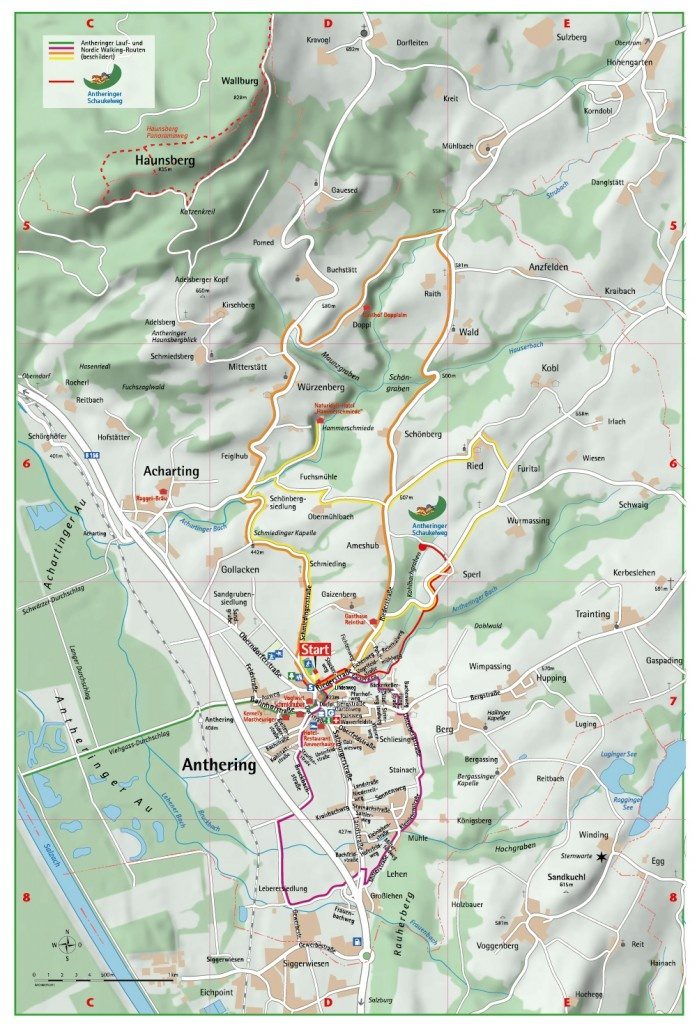 Rund um Anthering findest du wunderschöne Lauf und Nordic Walking Strecken, die bestens beschildert sind. Alle Routen starten beim Sportheim Anthering und führen dich durch abwechslungsreiche Landschaften – von der Salzach über kleine Siedlungen bis hin zu schönen Aussichtspunkten.